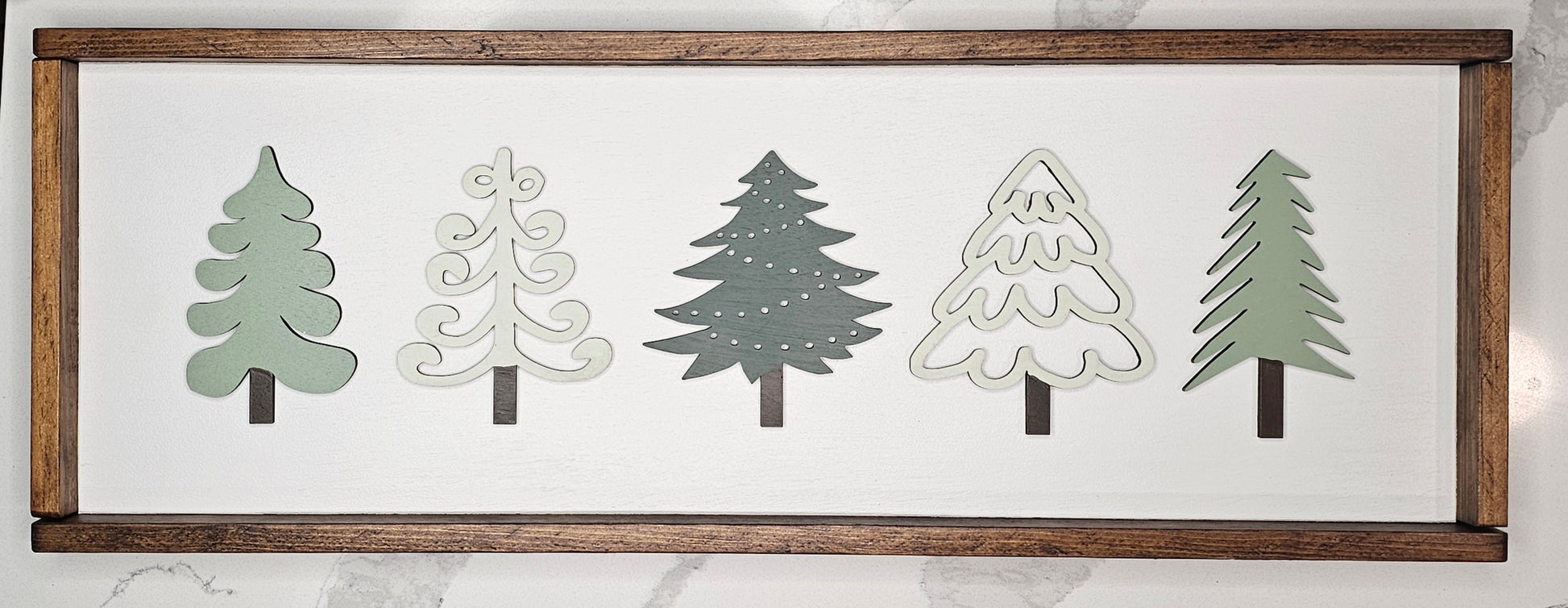 Laser cut of 5 trees shape with solid white paint background.